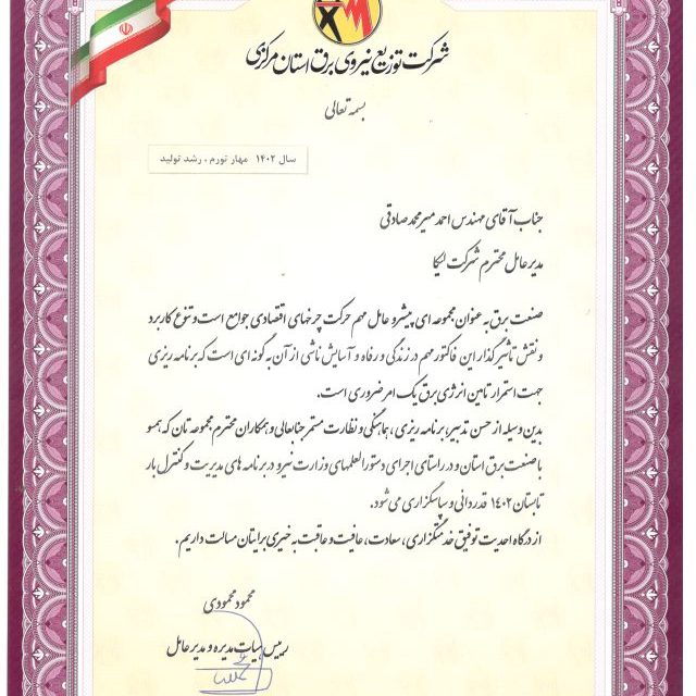 تقدیر شرکت نیروی برق استان مرکزی از عملکرد موفق شرکت لیکا